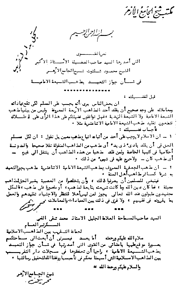 Ya’qubi dit: "Il fut le meilleur et le plus instruit dans la religion d’Allah. Les hommes de science, en le citant, disaient: l’instruit nous a dit." [4]Le 6 juillet 1959, Mahmoud Chaltout, recteur de la mosquée al-Azhar du Caire - l'une des références de l'islam sunnite moderne - délivre une fatwa historique reconnaissant le jafarisme (Ja’fari) ou ach-Chia al-Imamiyya al-Ithna ‘Achariyya (c'est-à-dire le douzième imam des chiites) comme une madhhab, une école juridique musulmane qui est religieusement correcte à suivre dans le culte, comme peuvent l'être d'autres écoles de pensée sunnites [5] [6]